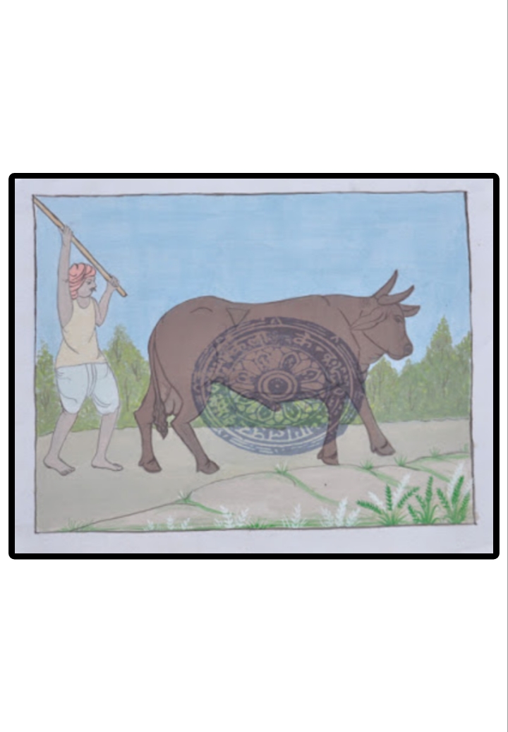 | Description | This painting depicts a farmer guiding a bullock with a stick. The bullock is carrying a decorative wheel-like structure on its body, which has intricate designs and patterns. The farmer is wearing a pink turban, a yellow sleeveless top, and white shorts, and is barefoot. The background shows trees against a blue sky, and there are some plants in the foreground. The overall scene seems to represent a traditional or rural Indian setting. |